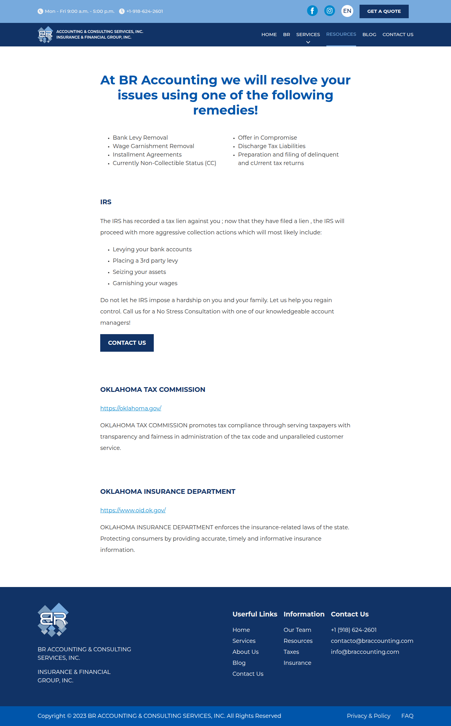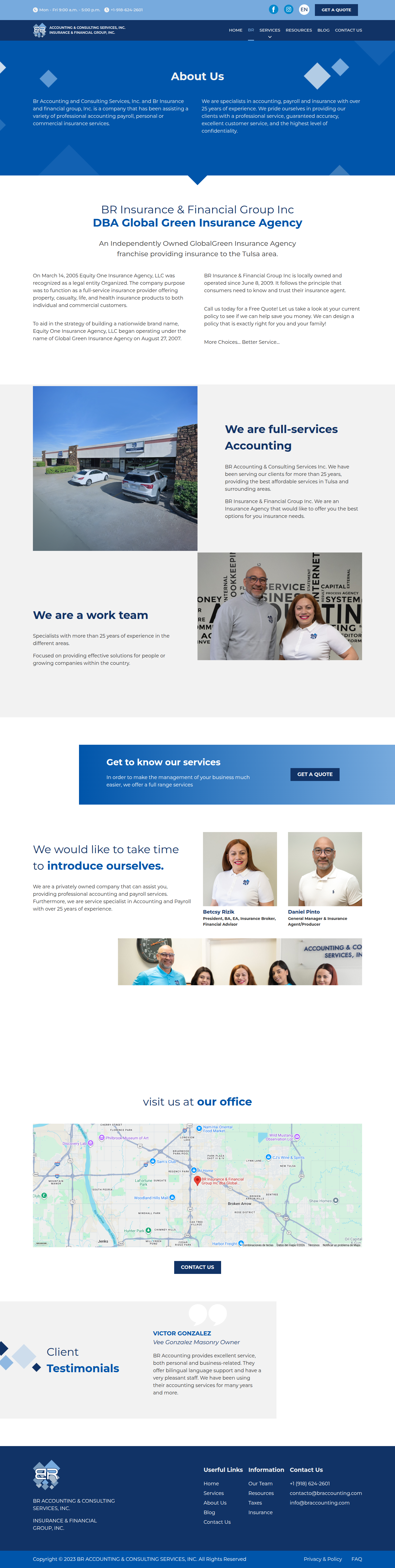 BR Accounting & Consulting Services y BR Insurance & Financial Group es una firma profesional con más de 25 años de experiencia en Tulsa, dedicada a ofrecer soluciones integrales en las áreas contable, financiera y de seguros tanto para individuos como para empresas en crecimiento. Se distinguen por su enfoque bilingüe, la precisión garantizada en sus procesos y un compromiso con la confidencialidad, operando bajo un modelo de atención personalizada que busca optimizar los recursos de sus clientes mediante asesoría experta y una amplia gama de opciones de cobertura.