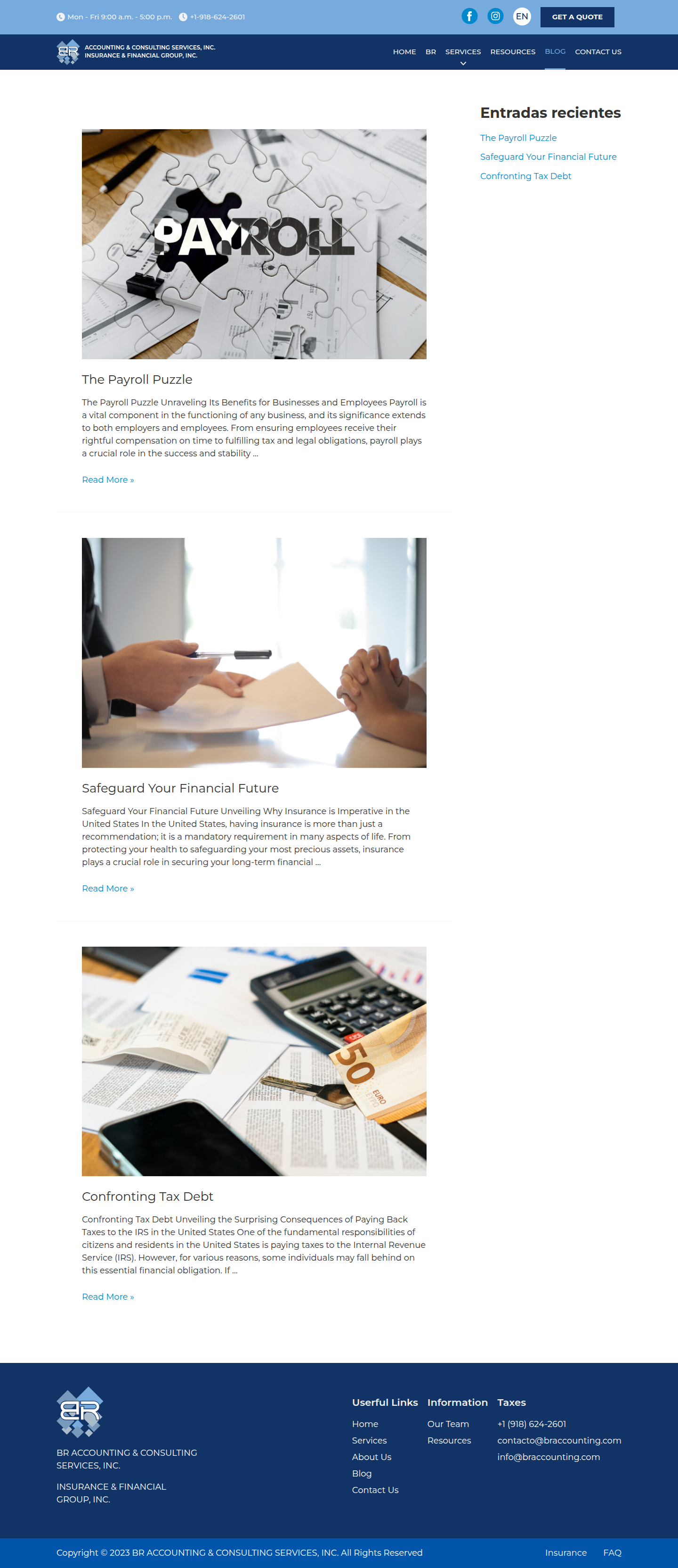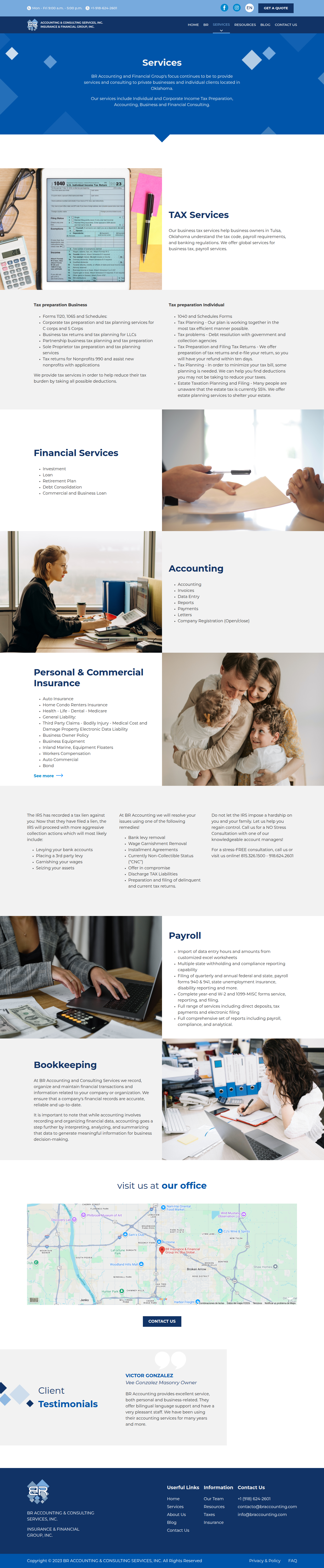 Desarrollo de una plataforma web corporativa para BR Insurance & Financial Group, una firma líder en asesoría contable y financiera con más de 25 años de trayectoria en Tulsa. El objetivo principal fue digitalizar la presencia de la marca, proyectando solidez, profesionalismo y confianza para su mercado bilingüe.